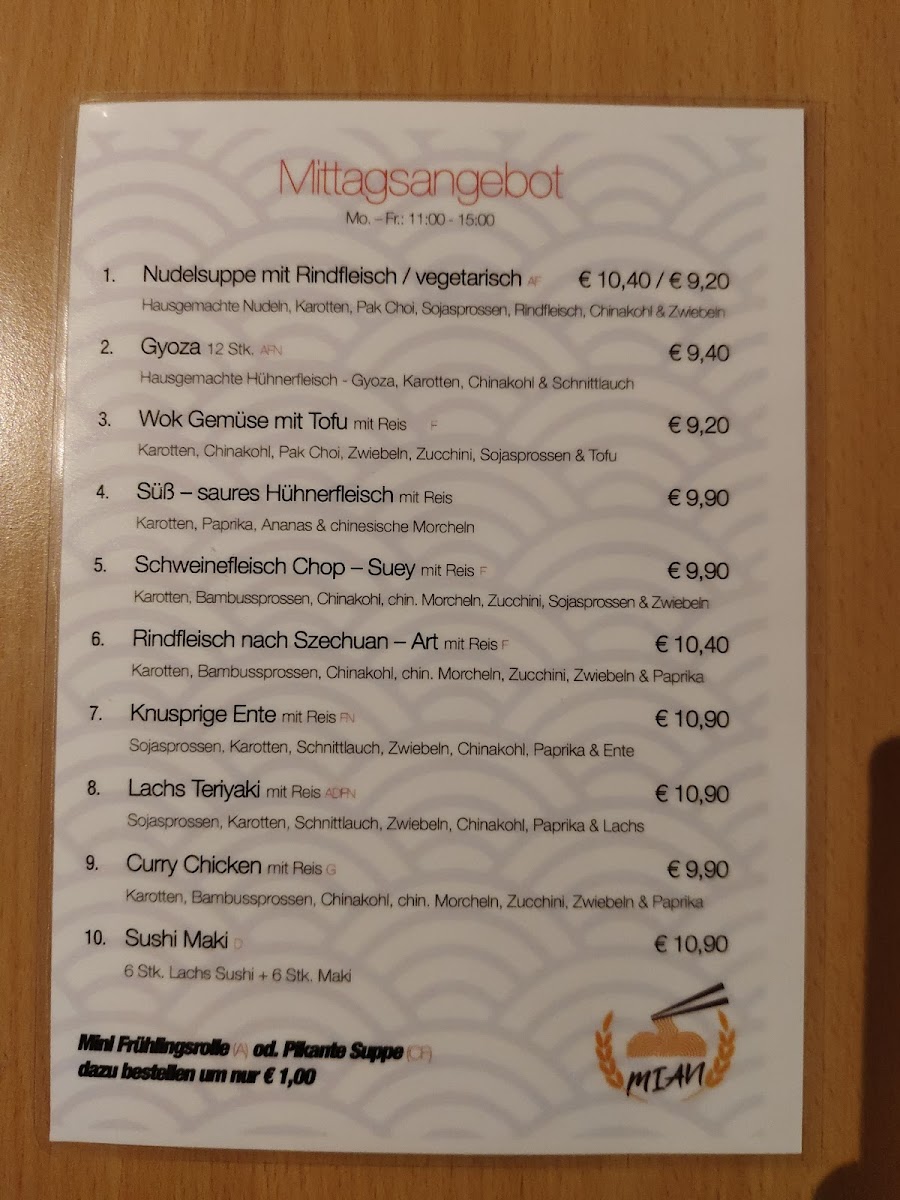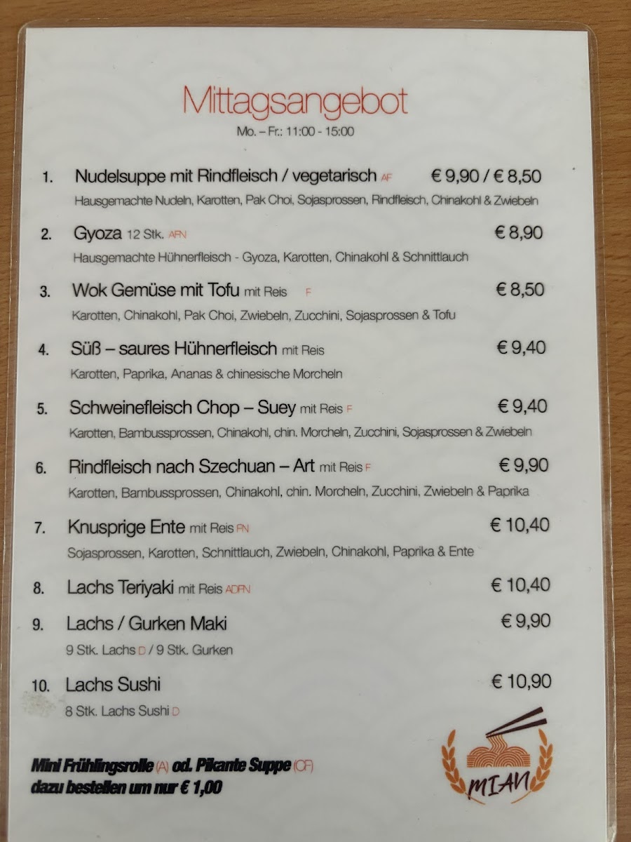Overall, the menu at Mian Vienna offers something for everyone, with each dish offering unique flavors and high-quality ingredients, ensuring a memorable dining experience for all.